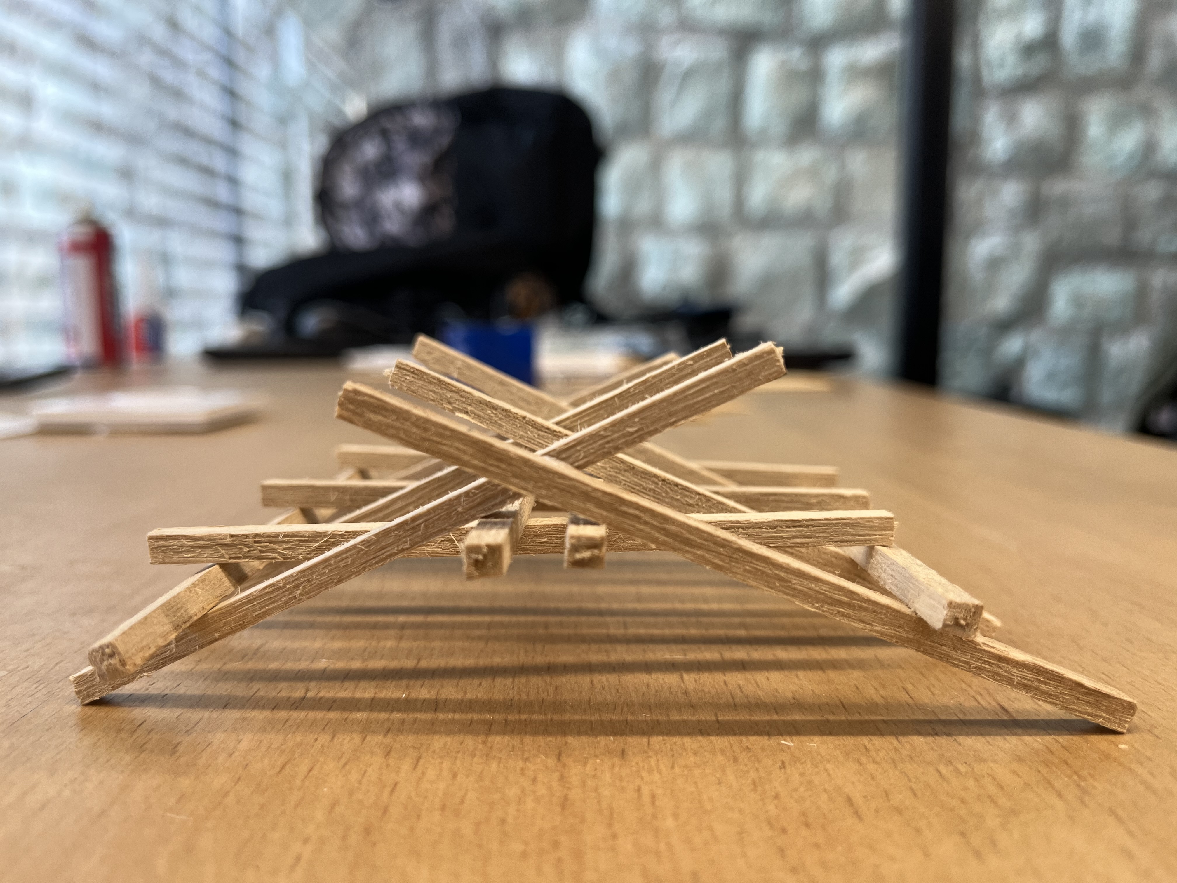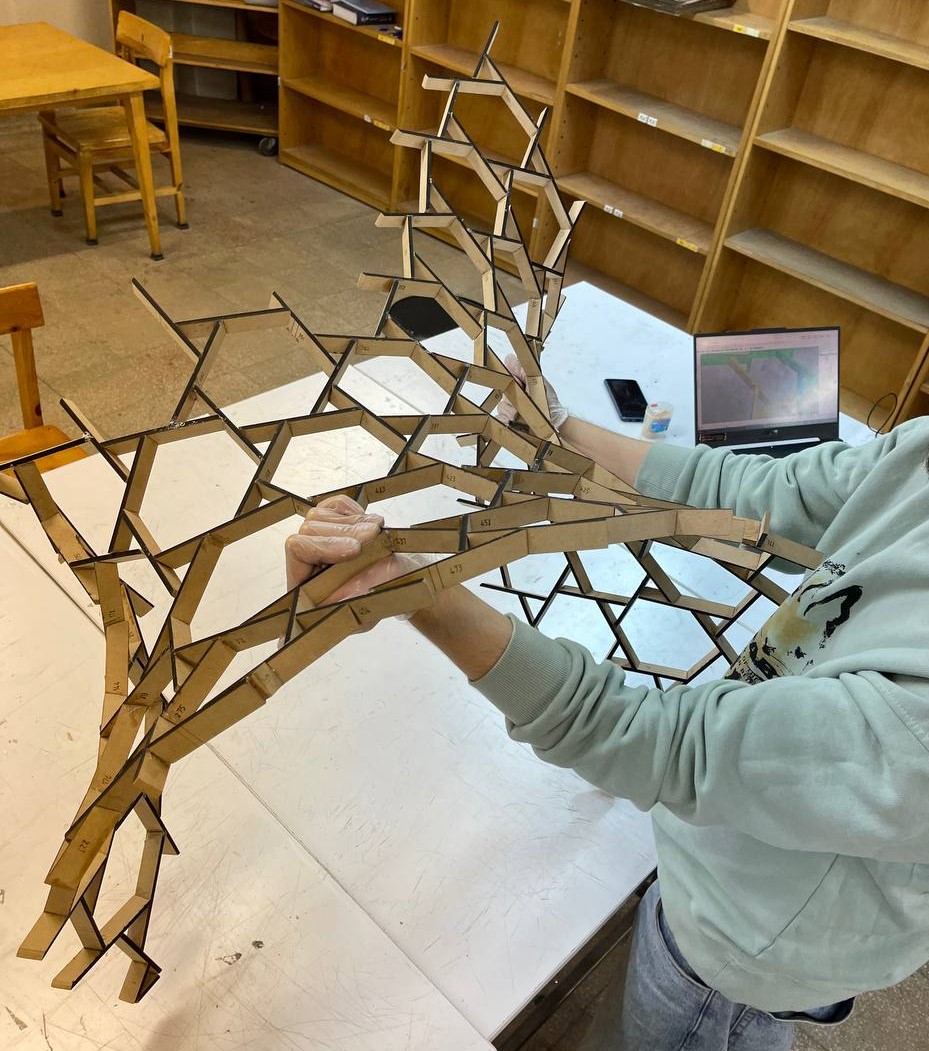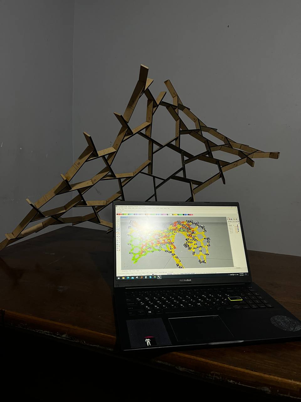 Different stages in the design of KAJE include research, form-finding, structural analysis, assembly, and fabrication.In the first stage of design, we experimented with the reciprocal structure functionality using test mock-ups such as the Da Vinci bridge and a small prototype that worked functionality the same. Next, we designed the model using Grasshopper and its plugins to analyze the structure behavior.