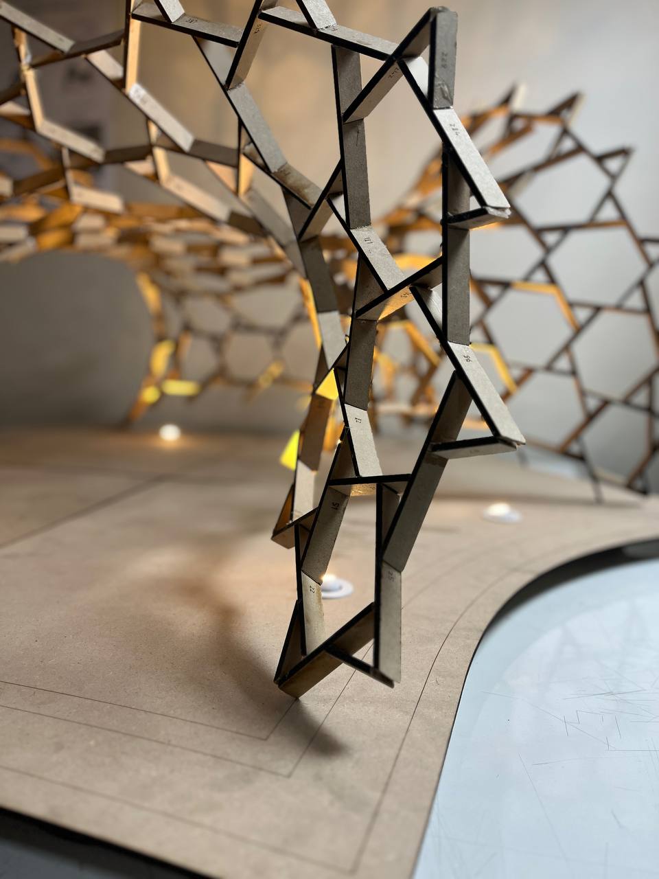 KAJE, a name imbued with beauty and continuity, encapsulates the essence of a shelter that seamlessly blends flow and structural integrity. the shelter adapts to its surroundings, creating a harmonious connection with nature. The shelter’s reciprocal frame mimics the strength of a honeycomb, ensuring stability against external forces. This shelter provides a sanctuary, a place of refuge that embodies the channels of flow, beauty, and resilience.