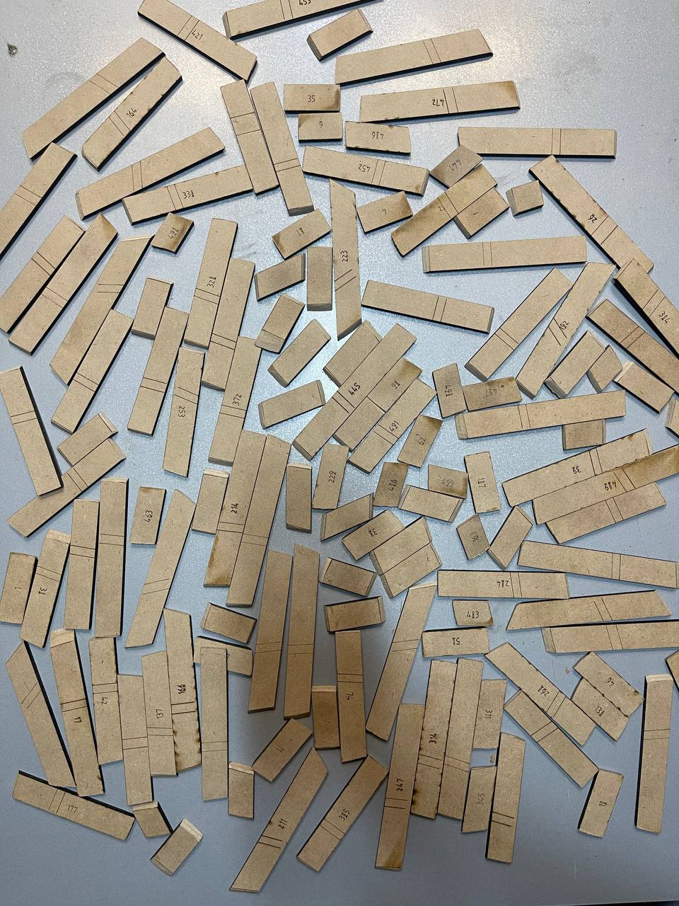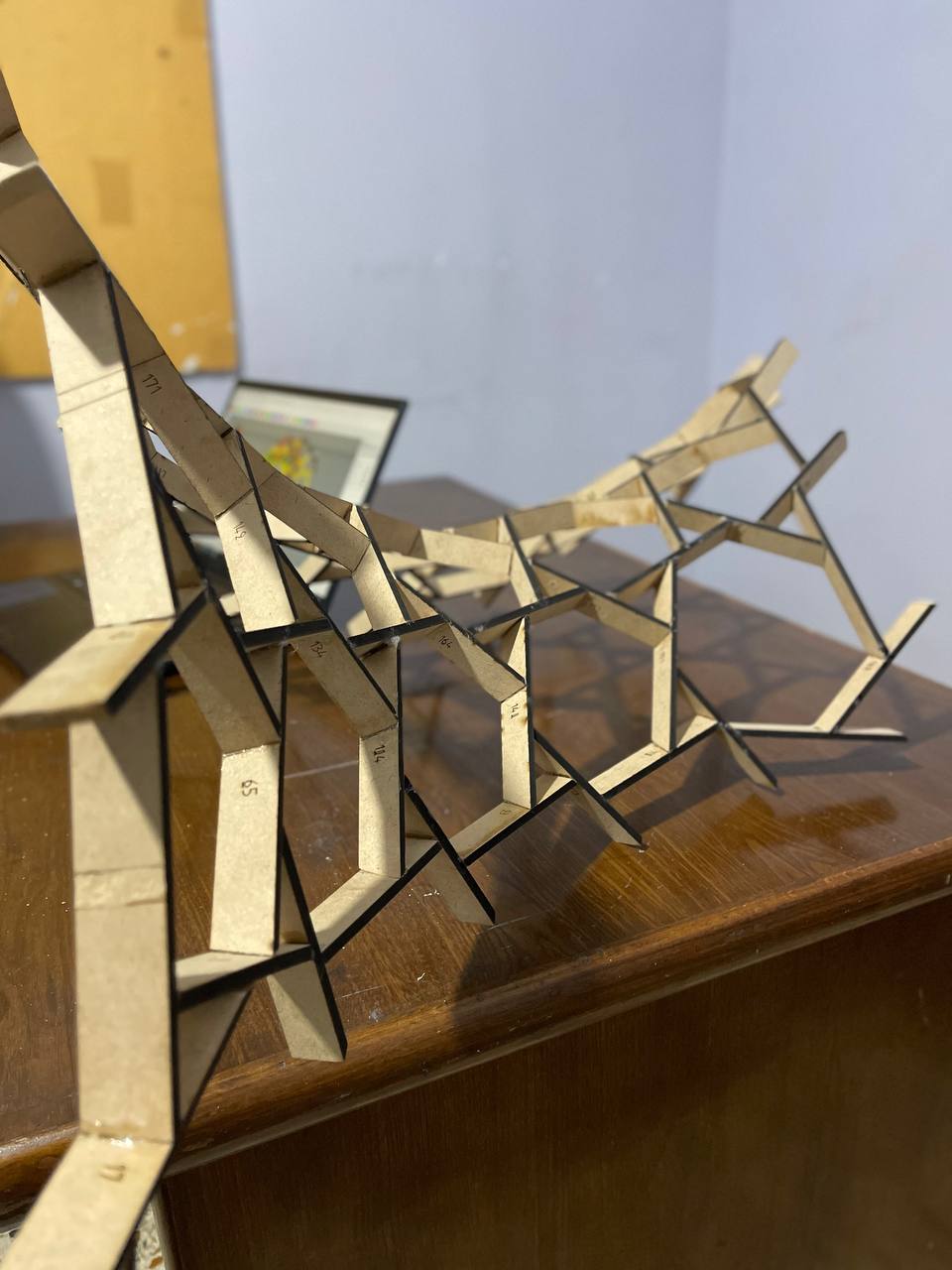 In the final stage, attention shifts to the practical aspects of digital fabrication and construction techniques applicable to reciprocal structures. MDF sheets were converted into force transfer motifs designed using Grasshopper and a laser cutting machine. After that, the parts are assembled and glued together, resulting in the final form.