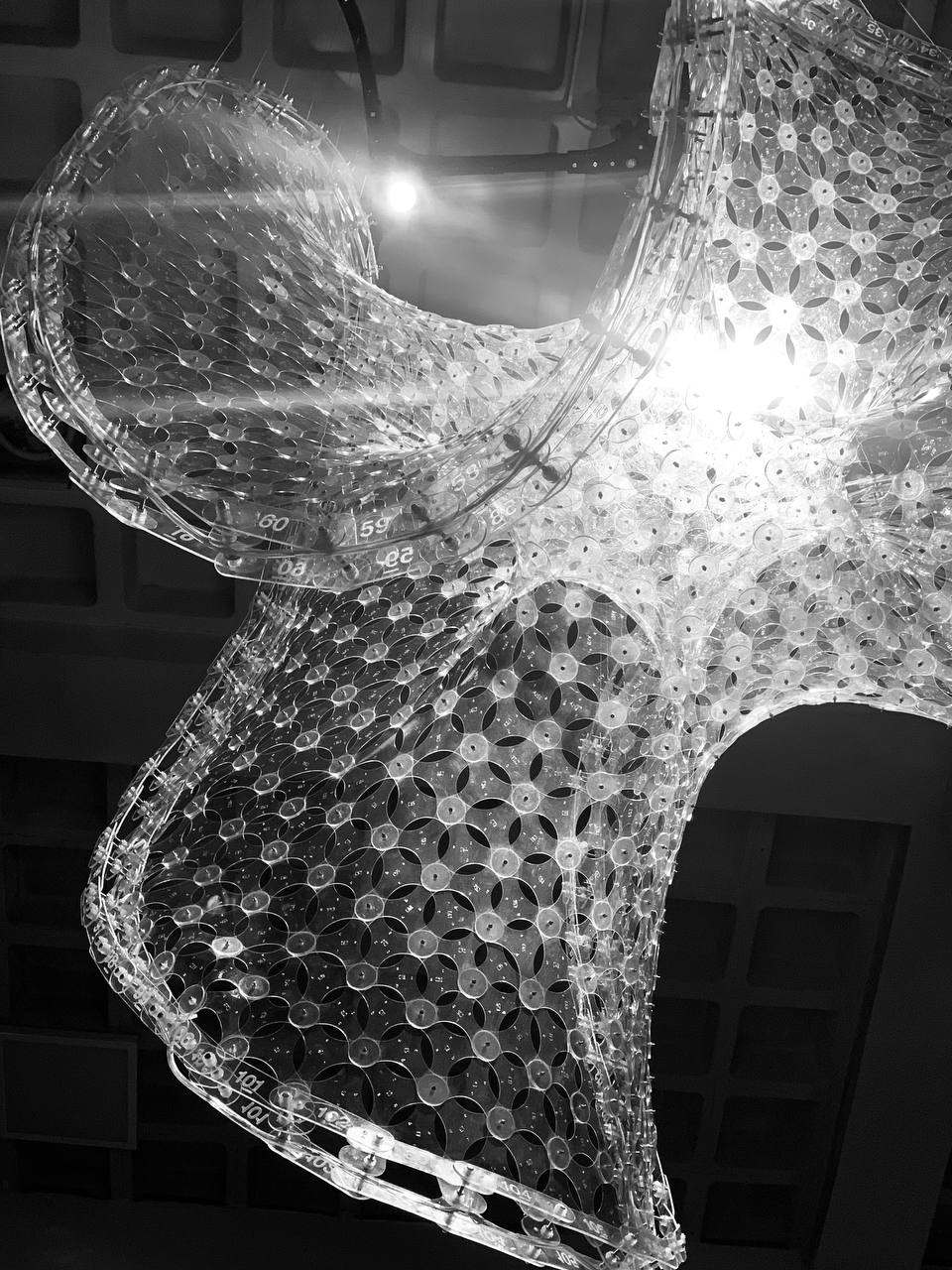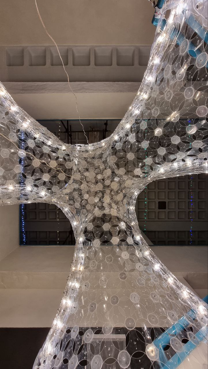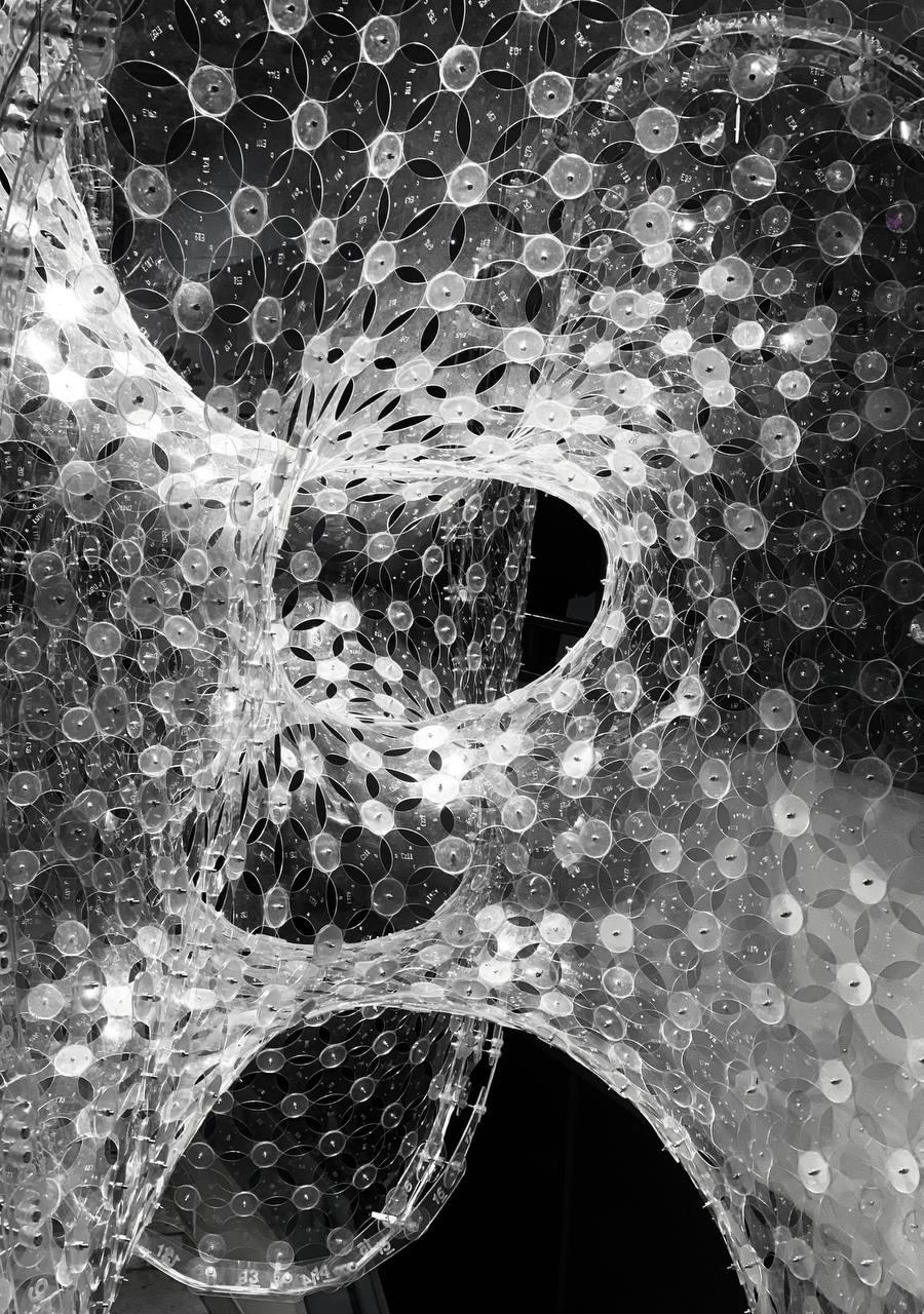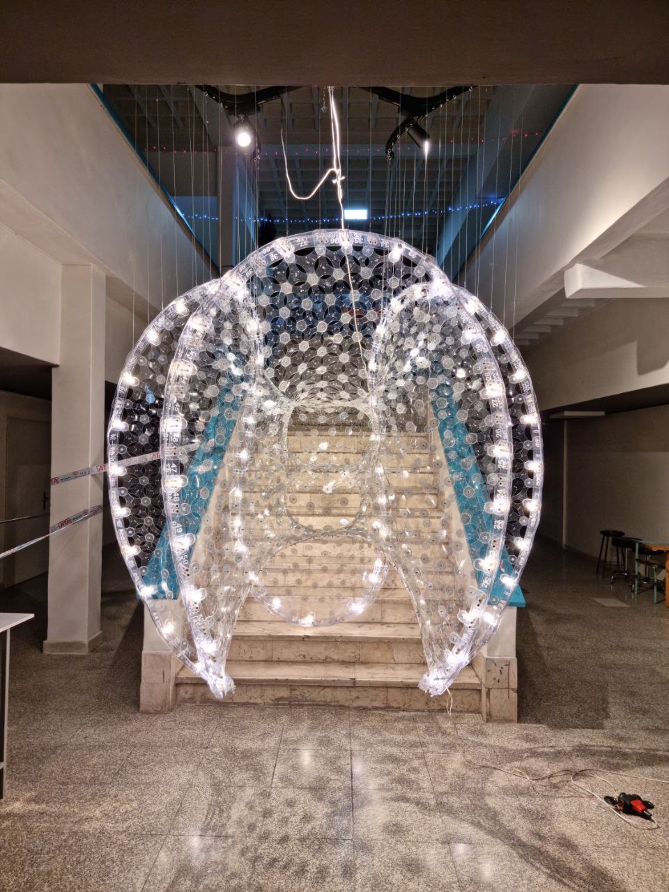 This remarkable project embraces the enchanting power of light to create stunning visual effects within a captivating architectural structure. Inspired by nature and minimal surfaces, a magnificent curved shell was meticulously crafted and assembled. Extensive research and prototyping led to the incorporation of a 4mm flat polycarbonate frame to enhance stability and maintain the shell's tensile behavior. Finally, in May 2023, the project reached its full-scale realization, with the shell elegantly suspended from a plate adorned with 43 hooks. This awe-inspiring endeavor showcases extraordinary innovation and artistic prowess in the realms of architecture and construction.