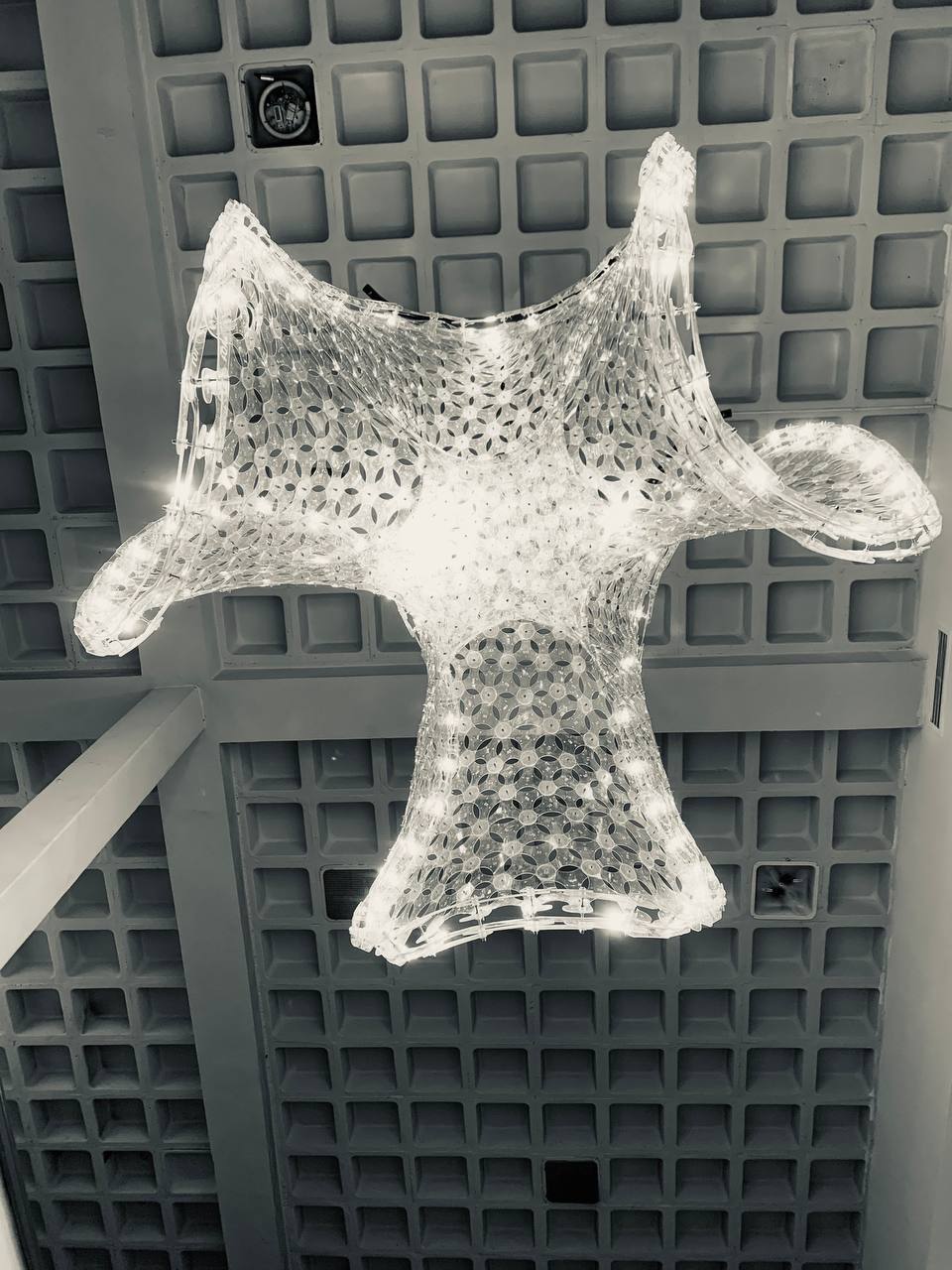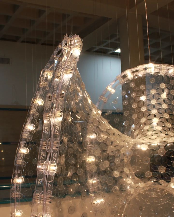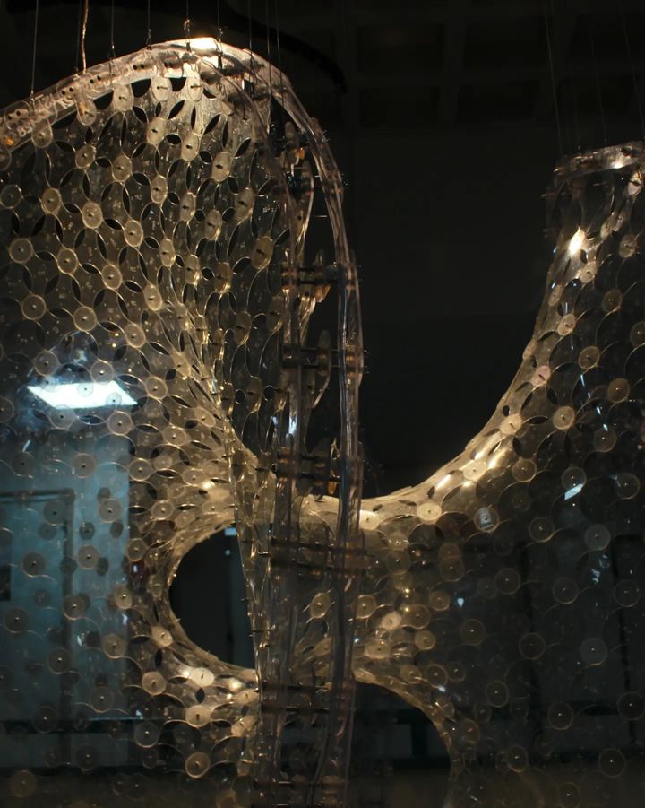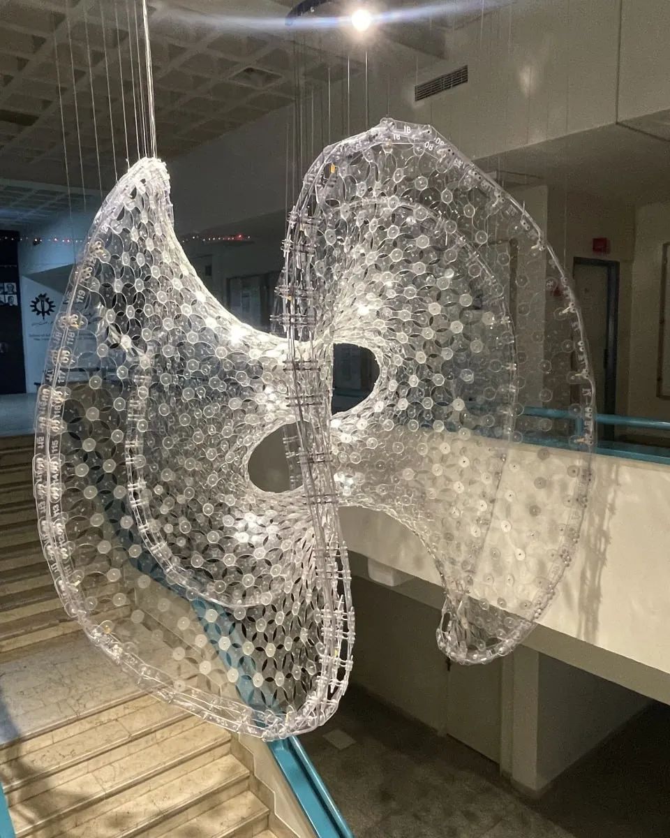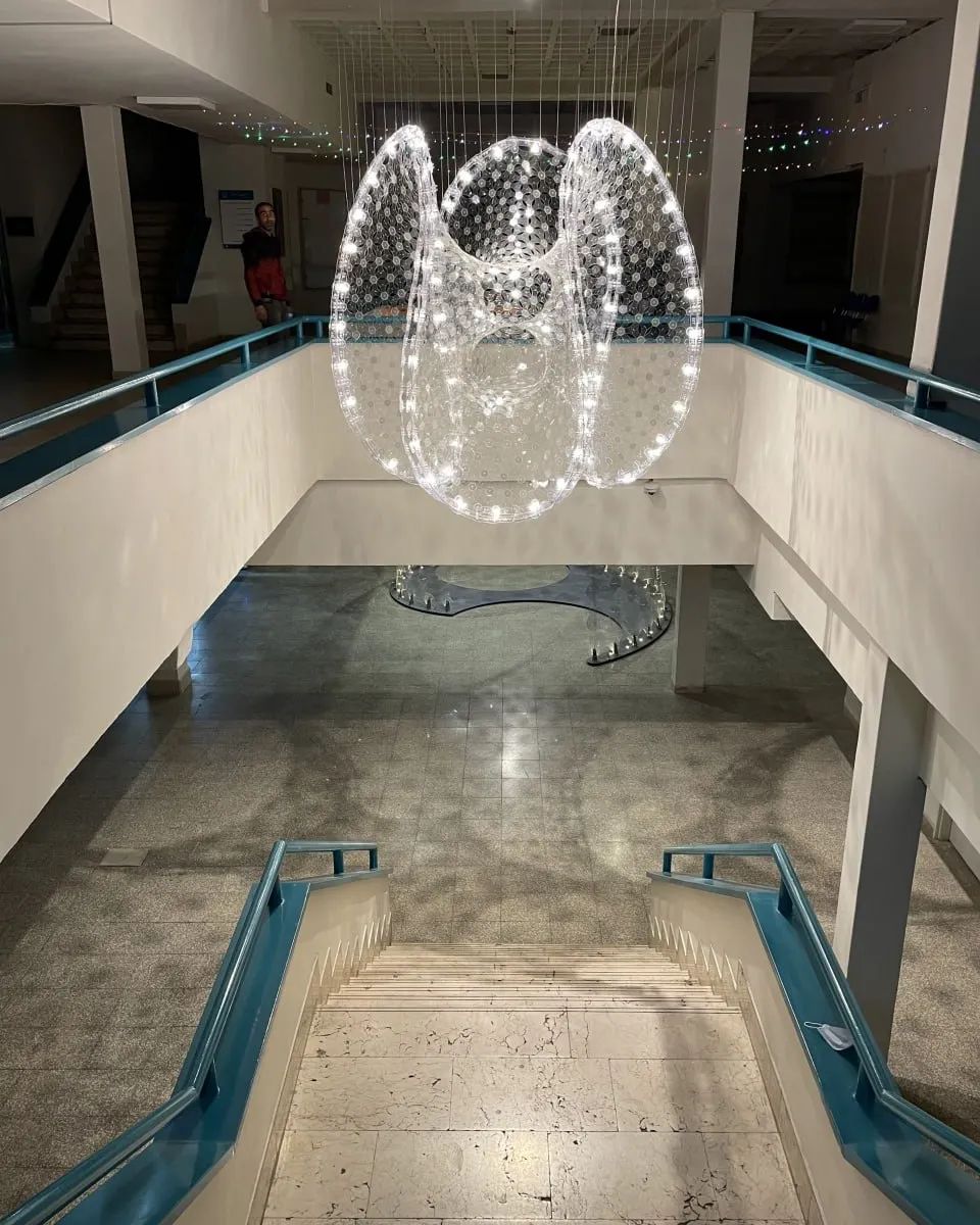This remarkable project embraces the enchanting power of light to create stunning visual effects within a captivating architectural structure. Inspired by nature and minimal surfaces, a magnificent curved shell was meticulously crafted and assembled. Extensive research and prototyping led to the incorporation of a 4mm flat polycarbonate frame to enhance stability and maintain the shell's tensile behavior. Finally, in May 2023, the project reached its full-scale realization, with the shell elegantly suspended from a plate adorned with 43 hooks. This awe-inspiring endeavor showcases extraordinary innovation and artistic prowess in the realms of architecture and construction.
