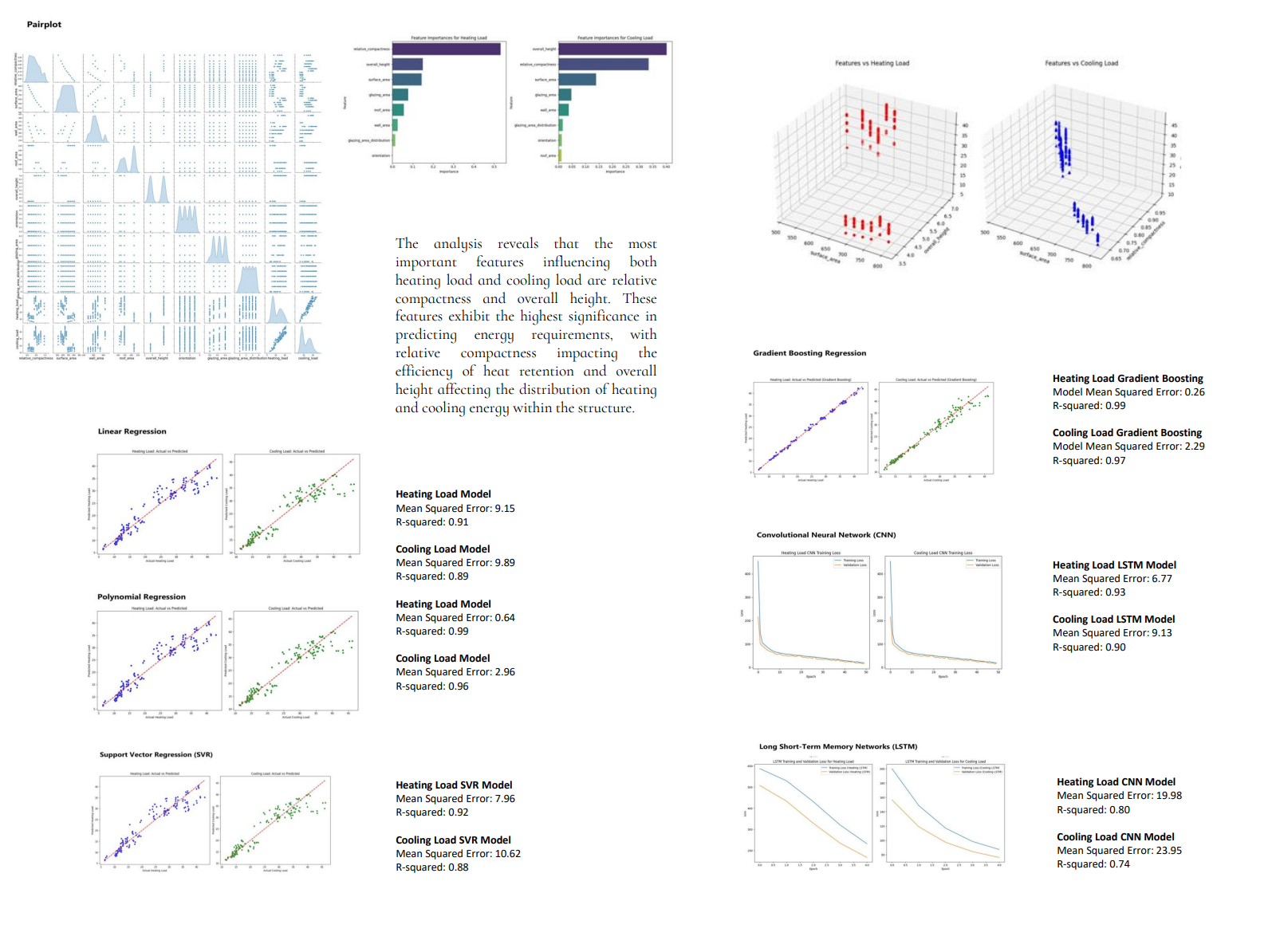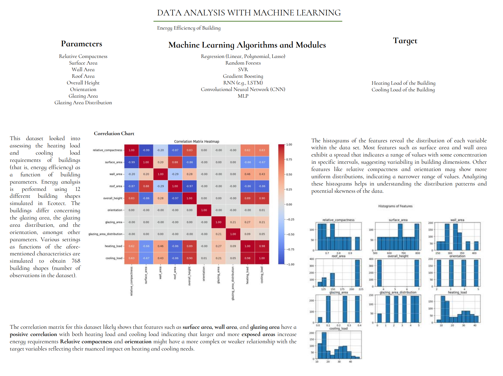 I dove into analyzing 8 crucial building features (like relative compactness, surface area, and roof area) using a dataset of 768 entries from kaggle.com. The results were impressive: linear regression hit an accuracy of 0.89 for cooling load and 0.91 for heating load, while polynomial regression soared with 0.96 for cooling load and an outstanding 0.99 for heating load.