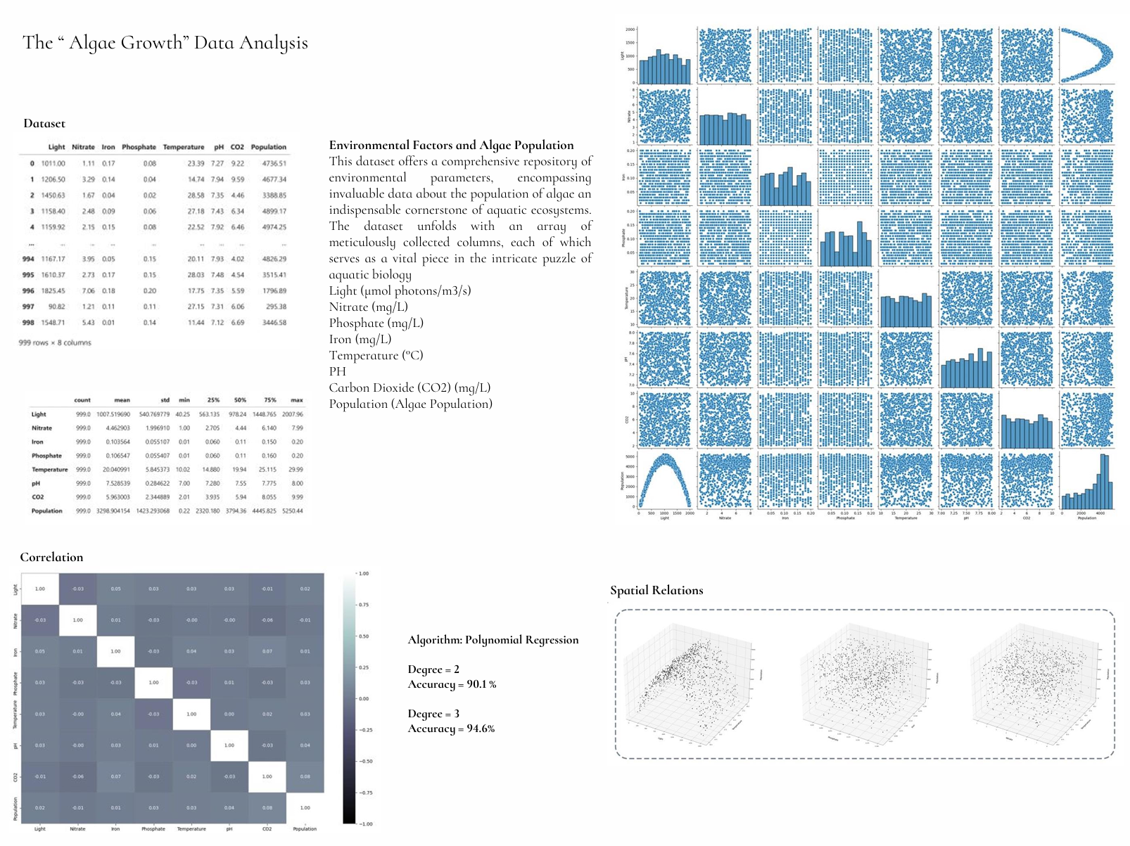 This is the result of analysing a dataset called "The Algae Growth"(Kaggle ), using machine learning algorithms. Based on dataset, there are 7 factors affect the algae population in the environment: Light, Nitrate, Iron, Phosphate, Temperature, pH and CO2. According to data analysis charts, there is no sign of linear relation between features and target, leading to choose the Linear Regression algorithm for. Therefore the Polynomial Regression was selected as the possible algorithm to describe dataset and predict the new targets better.